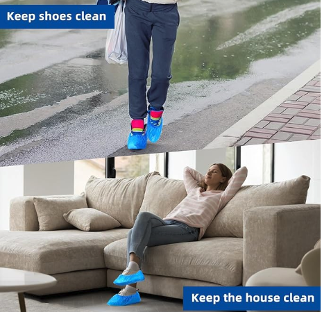 Shoe covers in white and blue color, one-use, made of PE and CPE material.
