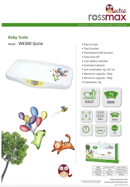 This scale holds up to 20 kgs so you can use it as a baby and toddler weighing scale. Rossmax WE300 Qutie Baby Scale is beautifully designed to ensure the comfort of your baby. The smooth platform is curved to comfortably cradle your baby, while you check for healthy readings. Place the baby on the scale and the scale will provide an accurate measurement of your baby’s weight.
