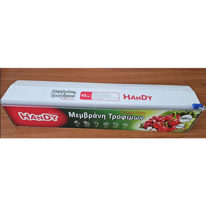 Measuring at an ample 43cm width and 200 meters, this film is perfect for covering big containers or bulky food items with large surface areas. It comes encased in a sturdy cardboard box that features the innovative, patented Slide Cutter, ensuring superior safety within your bakery, deli, restaurant, or catering kitchen.